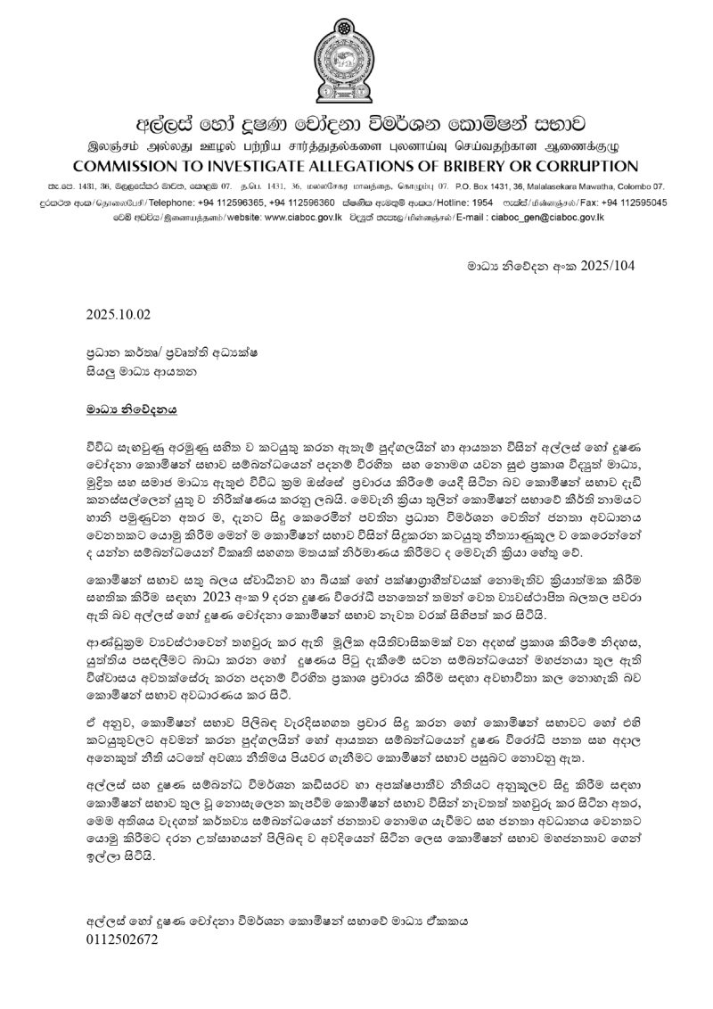 ඇතැම් පුද්ගලයින් හා ආයතන විසින් අල්ලස් හෝ දුෂණ චෝදනා කොමිෂන් සභාව සම්බන්ධයෙන් පදනම් විරහිත සහ නොමග යවන සුළු ප්‍රකාශ විද්‍යුත් මාධ්‍ය, මුද්‍රිත සහ සමාජ මාධ්‍ය ඇතුළු විවිධ ක්‍රම ඔස්සේ ප්‍රචාරය කිරීමේ යෙදී සිටින බව අල්ලස් හෝ දුෂණ චෝදනා කොමිෂන් සභාව පවසනවා. අල්ලස් හෝ දූෂණ චෝදනා විමර්ශන කොමිෂන් සභාවේ මාධ්‍ය ඒකකය නිවේදනයක් නිකුත් කරමින් සඳහන් කර සිටියේ මෙවැනි ක්‍රියා තුලින් කොමිෂන් සභාවේ කීර්ති නාමයට හානි පමුණුවන අතර ම, දැනට සිදු කෙරෙමින් පවතින ප්‍රධාන විමර්ශන වෙතින් ජනතා අවධානය වෙනතකට යොමු කිරීම මෙන්ම කොමිෂන් සභාව විසින් සිදු කරන කටයුතු නීත්‍යානුකූල ව කෙරෙන්නේ ද යන්න සම්බන්ධයෙන් විකෘති සහගත මතයක් නිර්මාණය කිරීමට ද හේතු වන බවයි අල්ලස් හෝ දුෂණ චෝදනා කොමිෂන් සභාව නිකුත් කල නිවේදනය පහතින්