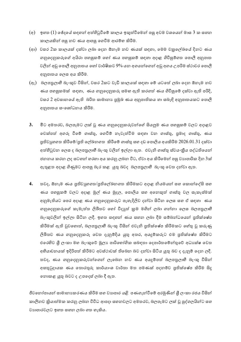 ණය ගනුදෙනුකරුවන් අදාළ බලපත්රලාභි බැංකු වෙත ලිඛිතව හෝ විද්යුත් මාර්ගයෙන් 2026.01.15 දිනට පෙර ඉල්ලීමක් කළ විට සහන ලබාදෙන ලෙසට බලපත්රලාභි බැංකු වෙත එම චක්රලේඛයෙන් දැනුම්දී ඇති බවයි ශ්රී ලංකා මහබැංකුව නිවේදනය කළේ.