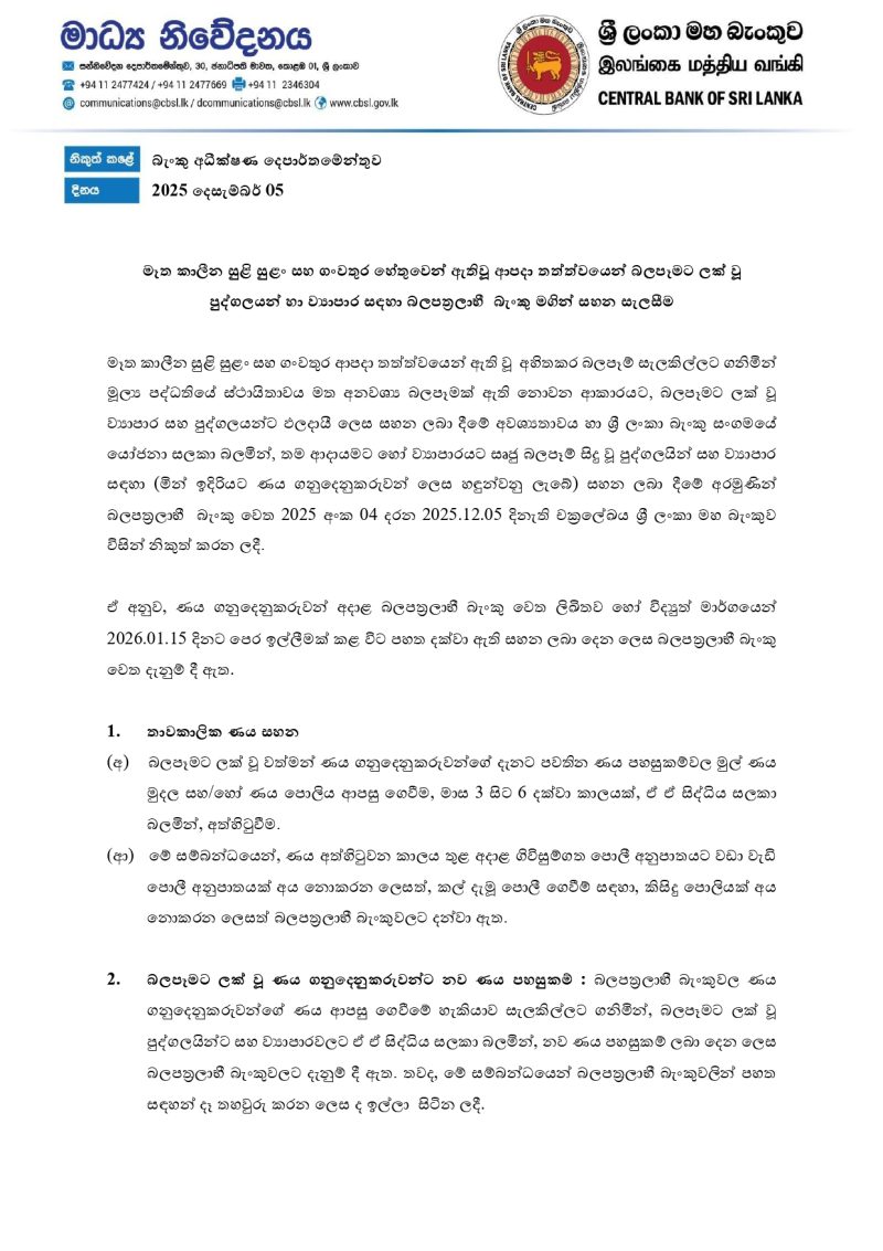 ණය ගනුදෙනුකරුවන් අදාළ බලපත්රලාභි බැංකු වෙත ලිඛිතව හෝ විද්යුත් මාර්ගයෙන් 2026.01.15 දිනට පෙර ඉල්ලීමක් කළ විට සහන ලබාදෙන ලෙසට බලපත්රලාභි බැංකු වෙත එම චක්රලේඛයෙන් දැනුම්දී ඇති බවයි ශ්රී ලංකා මහබැංකුව නිවේදනය කළේ.