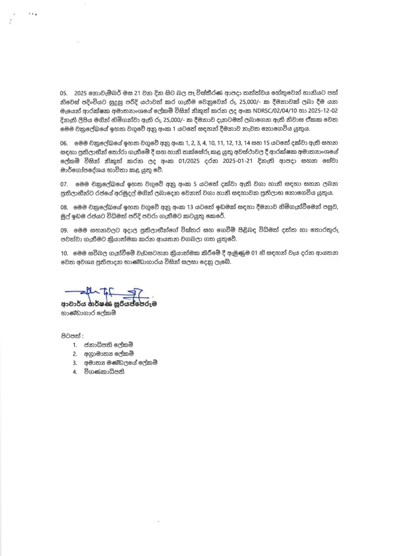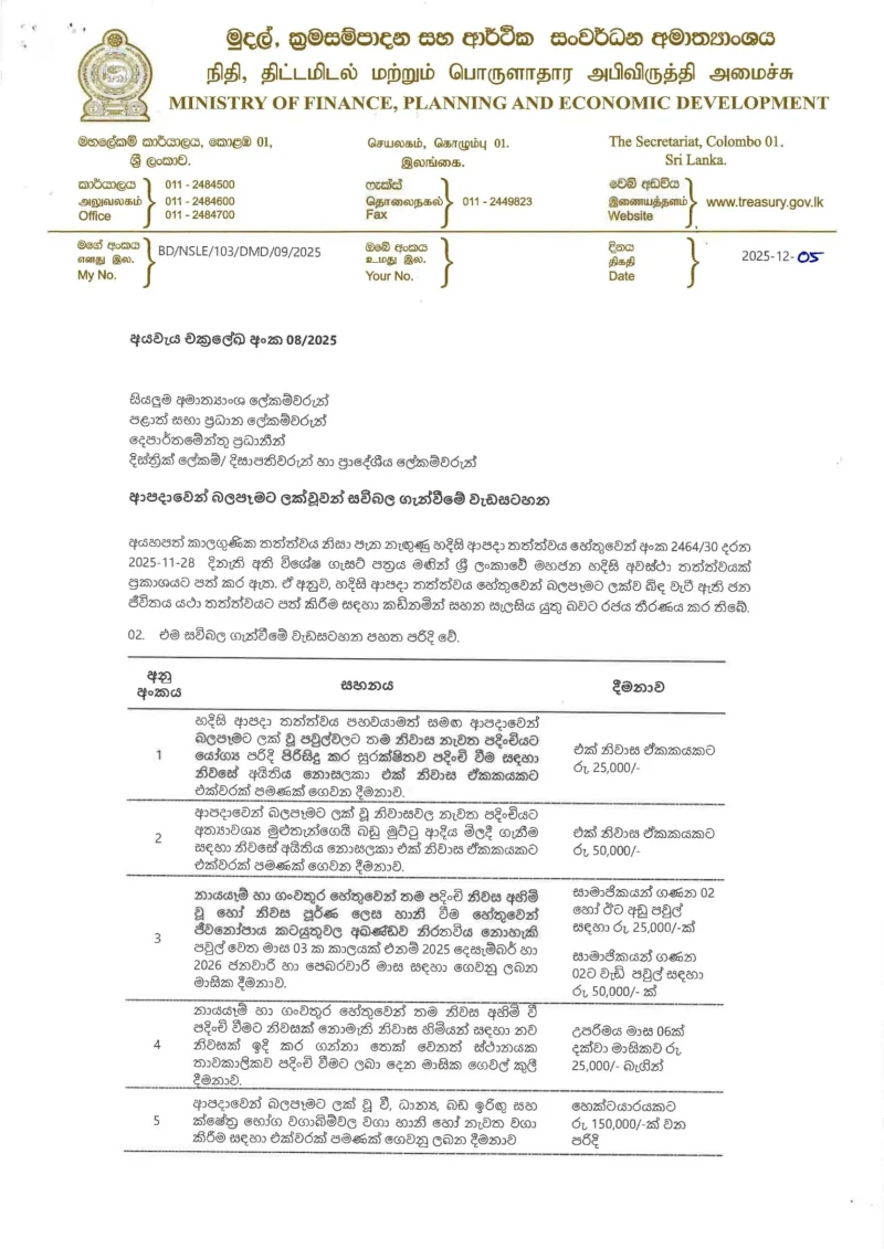 හදිසි ආපදා තත්ත්වය හේතුවෙන් බිඳ වැටී ඇති ජන ජීවිතය යථා තත්ත්වයට පත් කිරීම සඳහා කඩිනමින් සහන සැලසීම අරමුණු කර ගනිමින් විශේෂ චක්රලේඛයක් නිකුත් කර තිබෙනවා.