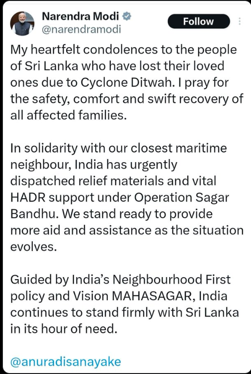 සාගර් බන්ධු මෙහෙයුම යටතේ ඉන්දියාව හදිසි සහන ද්රව්ය ලබා දී ඇති බවත්, තත්ත්වය වර්ධනය වන විට තවත් ආධාර සහ ආධාර ලබා දීමට අපි සූදානම් බවත් සිය X ගිණුමෙහි සටහනක් තබමින් වැඩි දුරටත් සඳහන් කර තිබෙනවා .