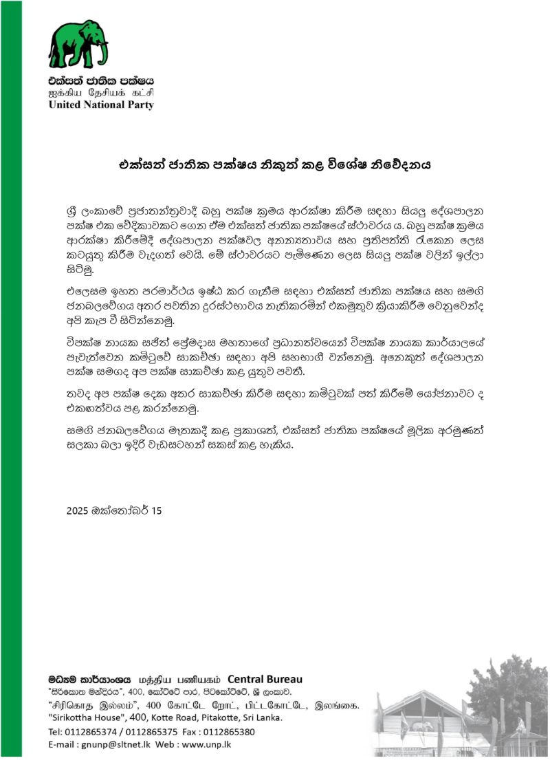 එක්සත් ජාතික පක්ෂය විශේෂ නිවේදනයක් නිකුත් කරමින් මේ බව් සඳහන් කර සිටියා.+