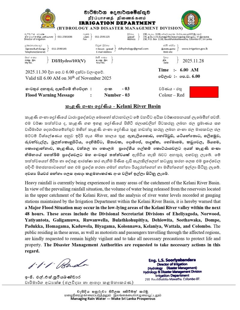 ඉදිරි පැය 48ක කාලය තුළ කැලණි ගංගා නිම්නයේ පහත්බිම් ප්‍රදේශවලට මහ ගංවතුර තත්ත්වයක් ඇතිවිය හැකි බවට අනතුරු ඇඟවීම් නිකුත් කර තිබෙනවා .