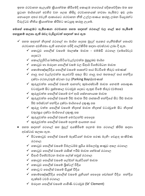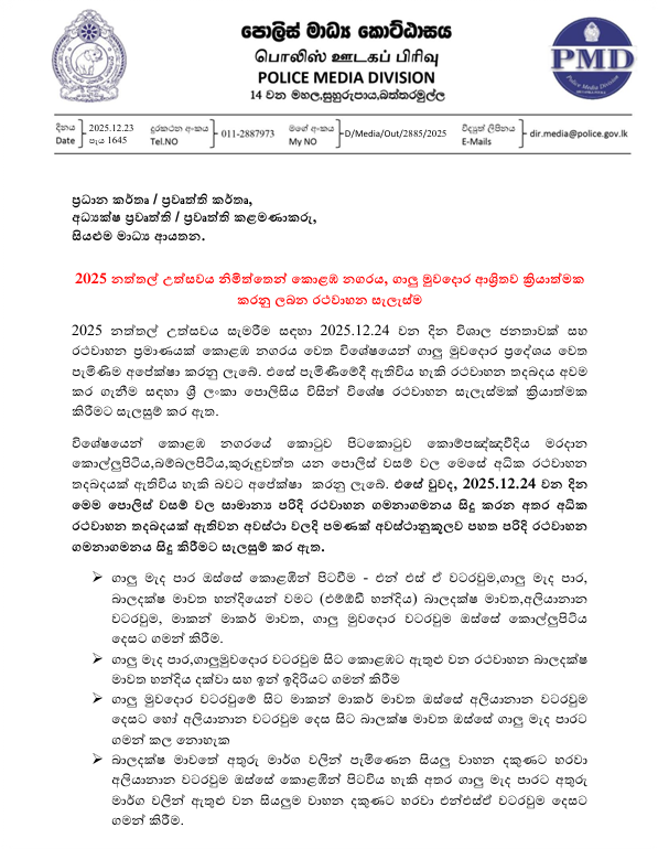 2025 නත්තල් උත්සවය නිමිත්තෙන් කොළඹ නගරය, ගාලු මුවදොර ආශ්රිතව ක්රියාත්මක කරනු ලබන රථවාහන සැලැස්ම පහතින් දැක්වේ.