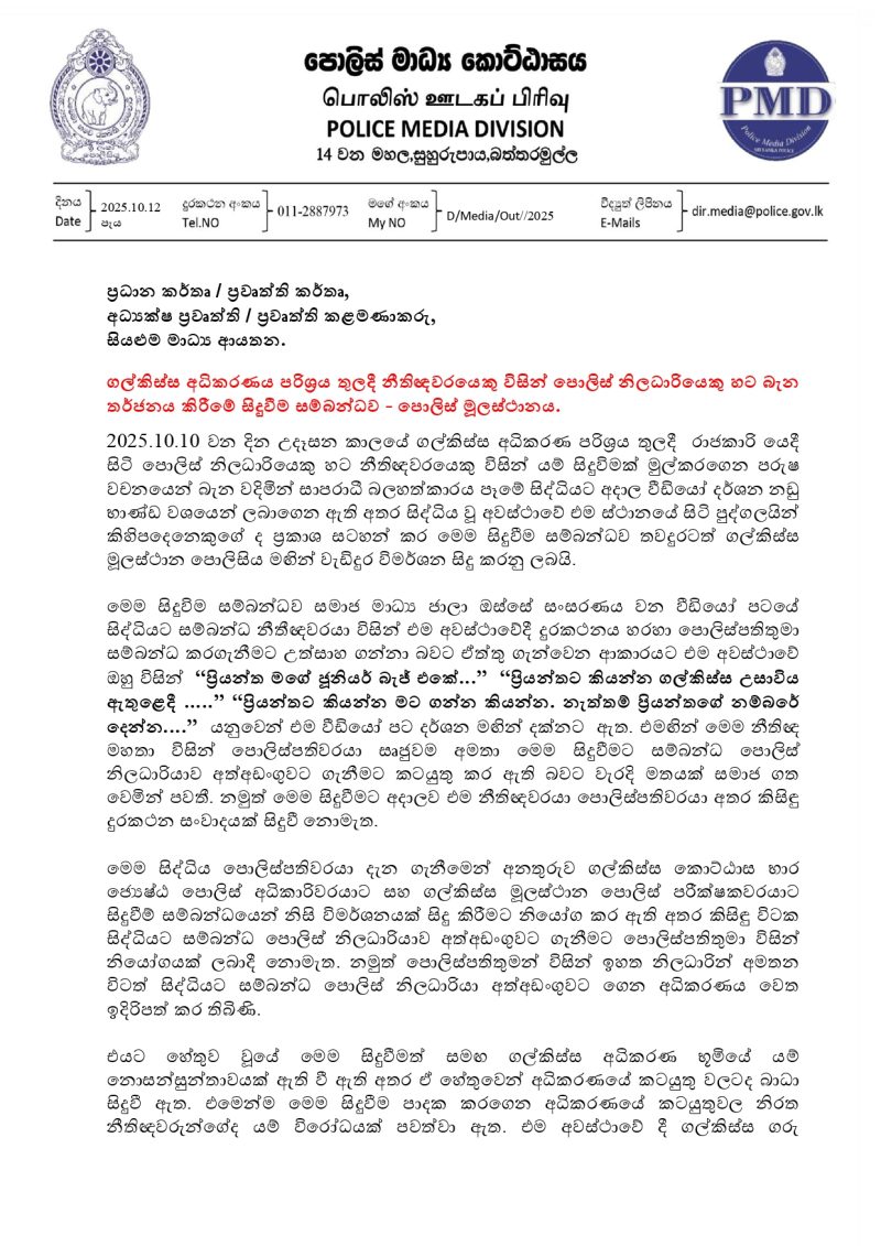 මේ සම්බන්ධයෙන් පොලිස් මාධ්‍ය කොට්ඨාශය නිකුත් කල නවතම නිවේදනය පහතින්