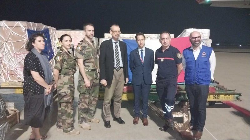 මෙම ආධාර තොගය භාර ගැනීම සදහා ශ්‍රී ලංකාවේ ප්‍රංශ තානාපති රෙමි ලැම්බර්ට් (Remi Lambert) මහතා , යුරෝපා සංගමයේ ශ්‍රී ලංකා තානාපති කාමෙන් මොරෙනෝ (Carmen Moreno) මහත්මිය ඇතුළු නිලධාරීන් පිරිසක් සහ ශ්‍රී ලංකා ආපදා කළමනාකරණ මධ්‍යස්ථානයේ නිලධාරීන් පිරිසක් ද කටුනායක ගුවන් තොටුපොළ වෙත පැමිණ සිටියා.