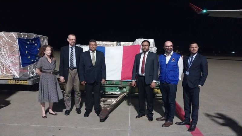 මෙම ආධාර තොගය භාර ගැනීම සදහා ශ්‍රී ලංකාවේ ප්‍රංශ තානාපති රෙමි ලැම්බර්ට් (Remi Lambert) මහතා , යුරෝපා සංගමයේ ශ්‍රී ලංකා තානාපති කාමෙන් මොරෙනෝ (Carmen Moreno) මහත්මිය ඇතුළු නිලධාරීන් පිරිසක් සහ ශ්‍රී ලංකා ආපදා කළමනාකරණ මධ්‍යස්ථානයේ නිලධාරීන් පිරිසක් ද කටුනායක ගුවන් තොටුපොළ වෙත පැමිණ සිටියා.