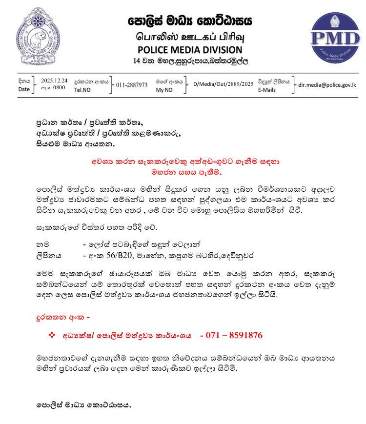 සැකකරුවෙකු අත්අඩංගුවට ගැනීම සදහා පොලිසිය මහජන සහය අවශ්ය අතර එම විස්තර ඇතුලත් නිවේදනය පහතින් සදහන් වනවා.