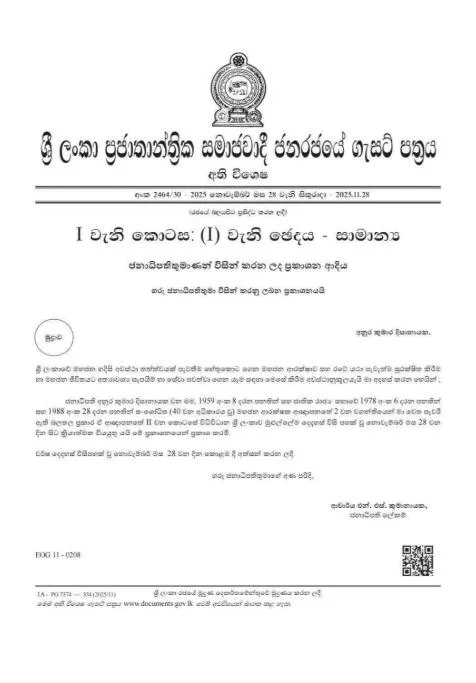 ශ්රී ලංකාවේ මහජන හදිසි අවස්ථා තත්ත්වයක් පැවතීම හේතු කොට ගෙන මහජන ආරක්ෂාව සහ රටේ යථා පැවැත්ම සුරක්ෂිත කිරීම හා ජන ජීවිතයට අත්යවශ්ය සැපයීම හා සේවා පවත්වාගෙන යාම සඳහා ජනාධිපති අනුර කුමාර දිසානායක මහතා විසින් ගැසට් නිවේදනයක් නිකුත් කර තිබෙනවා.