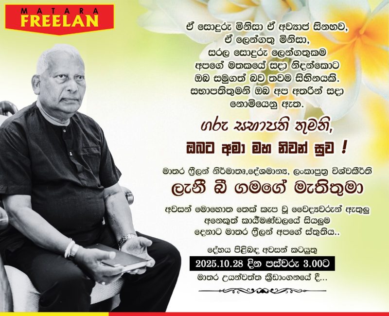 මාතර ෆ්‍රීලන් නිර්මාතෘ දේශමාත්‍ය, ලංකාපුත්‍ර, විශ්වකීර්ති ලැනී බී ගමගේ මහතා අභාවප්‍රාප්ත වී තිබෙනවා.