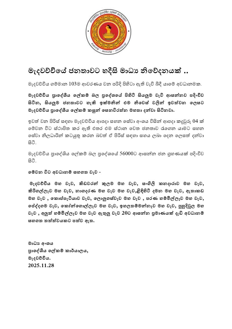 මැදවච්චිය ප්‍රාදේශීය ලේකම් බල ප්‍රදේශයේ පිහිටි සියලුම වැවි ආසන්නව පදිංචිව සිටින, සියලුම ජනතාවට හැකි ඉක්මනින් එම නිවෙස් වලින් ඉවත්වන ලෙසට දන්වා තිබෙනවා.