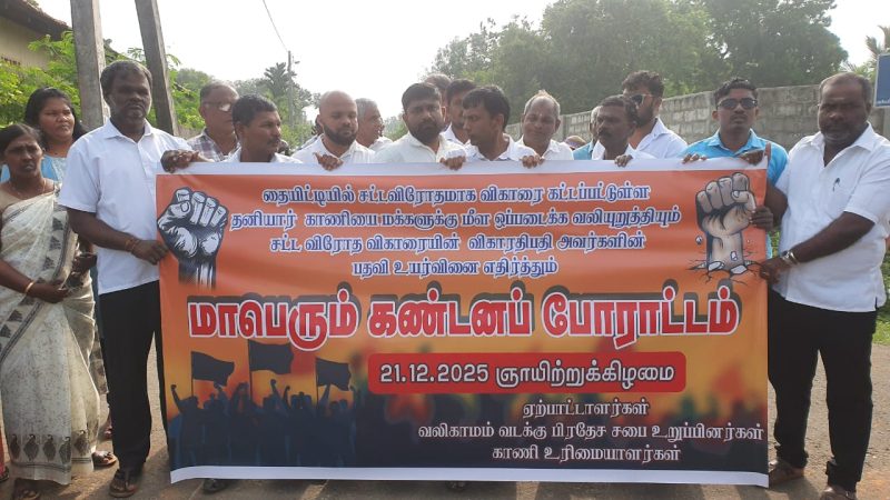 විරෝධතාවය අවස්ථාවේ වේලන් ස්වාමි ඇතුළු පුද්ගලයින් පස් දෙනෙකු අත්අඩංගුවට ගත් බවද විරෝධතාකරුවන් පවසා සිටියේ.