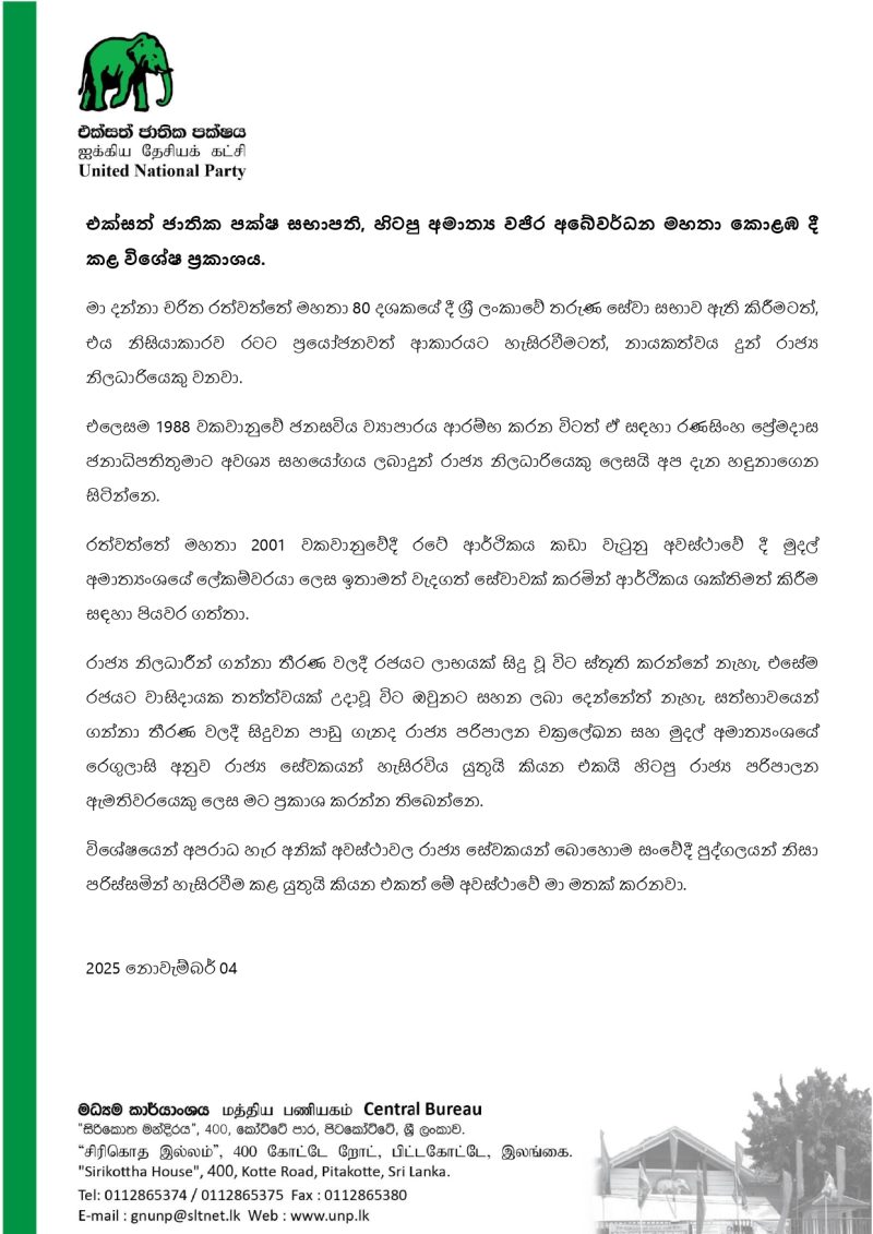 හිටපු අමාත්ය වජිර අබේවර්ධන මහතා නිකුත් කළ විශේෂ නිවේදනය පහතින්