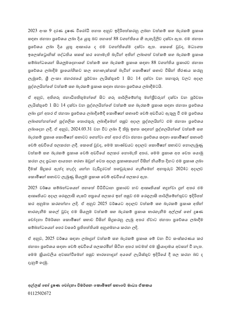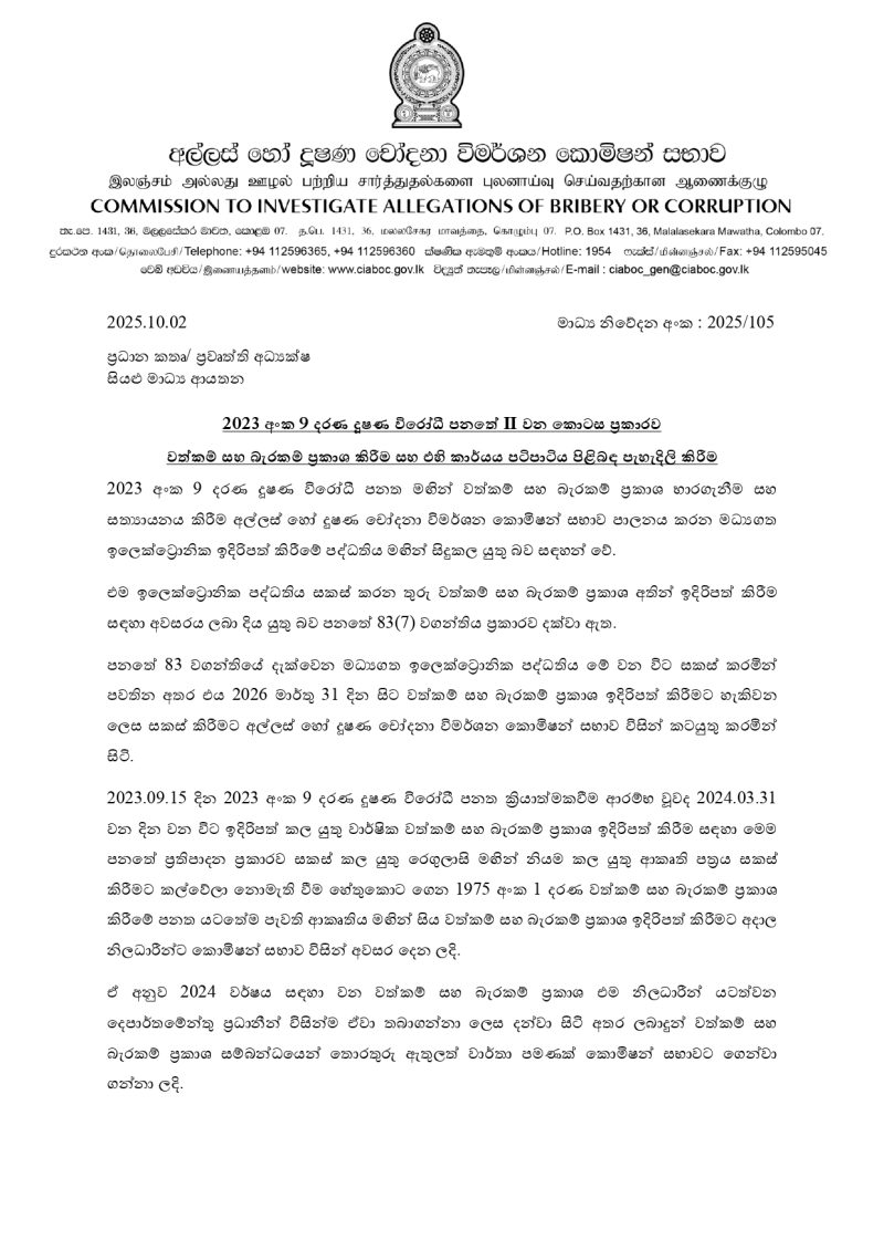 අල්ලස් හෝ දුෂණ චෝදනා විමර්ශන කොමිෂන් සභාව නිකුත් කල නිවේදනය පහතින්