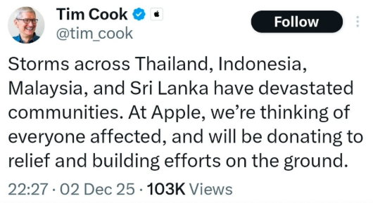 තායිලන්තය, ඉන්දුනීසියාව, මැලේසියාව සහ ශ්‍රී ලංකාව යන රටවල ඇතිවූ ආපදා තත්ත්වය හේතුවෙන් එම රටවල සිටින ජනතාව මේ වනවිට දැඩිලෙස පීඩාවට පත්ව සිටින බව ඇපල් සමාගමේ ප්‍රධාන විධායක නිලධාරීවරයා සඳහන් කර තිබෙනවා.