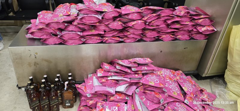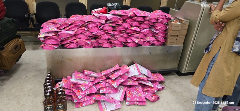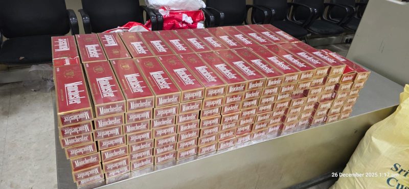 ඔවුන් විසින් රැගෙන ආ ගමන් මලු තුළ විදේශීය නිෂ්පාදිත "මැන්චෙස්ටර්" වර්ගයේ දුම්වැටි 44,000 ක් අඩංගු දුම්වැටි කාටූන් 220 ක්, විදේශීය මත්පැන් බෝතල් 19 ක් , රූපලාවන්ය කටයුතු සදහා භාවිතා කරන, සෞඛ්ය අමාත්යංශයේ සහ ජාතික ඖෂධ නියාමන අධිකාරියේ අවසරය නොමැති "කොලැජන්'' පැකැට් 430 ක් සහ තවත් පාවහන් සහ වෙළෙද භාණ්ඩ රාශියක් සහිත තොගයක් ද තිබී රේගු නිලධාරීවරුන් විසින් අත් අඩංගුවට ගෙන තිබෙනවා.
