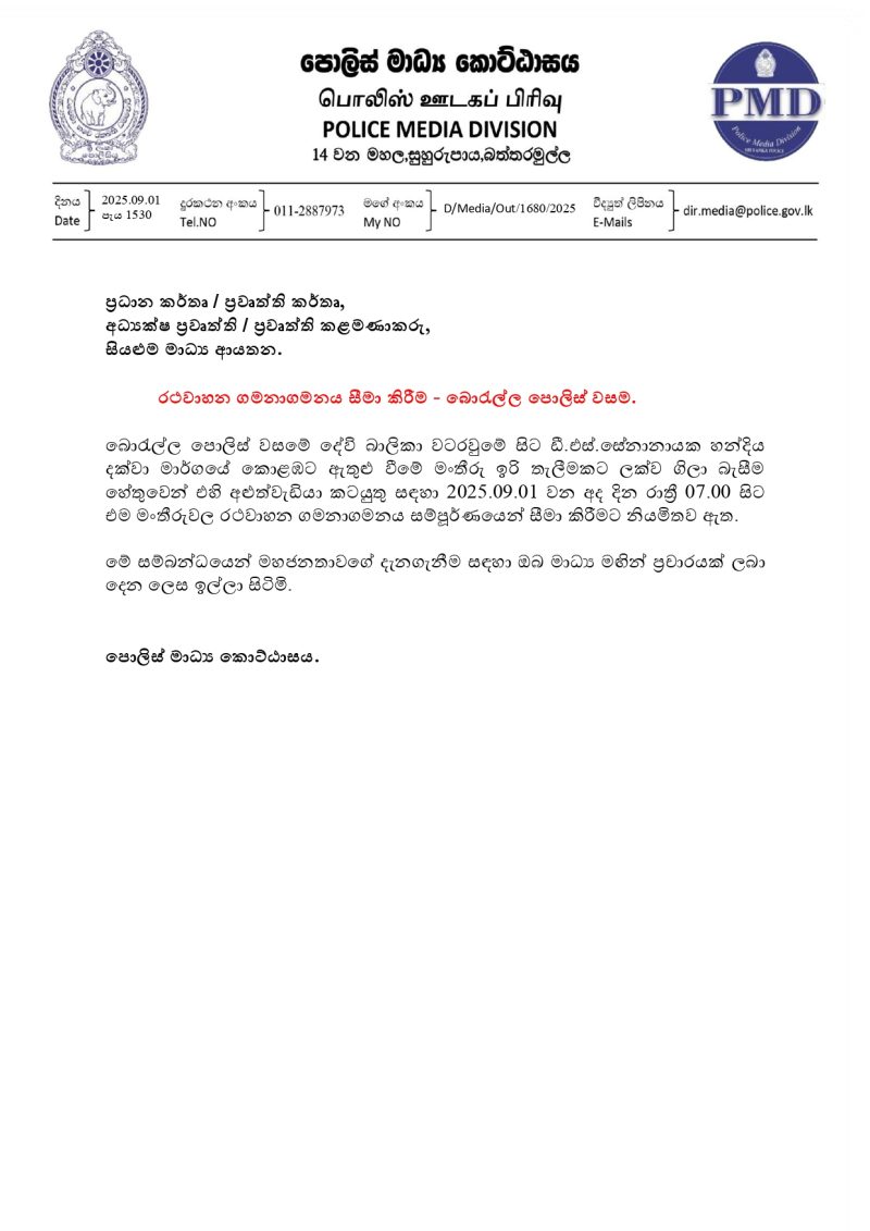 මංතීරු ඉරි තැලීමකට ලක්ව ගිලා බැසීම හේතුවෙන් බොරැල්ල පොලිස් වසමේ දේවි බාලිකා වටරවුමේ සිට ඩී.එස්.සේනානායක හන්දිය දක්වා මාර්ගයේ කොළඹට ඇතුළු වීමේ මංතීරුවල රථවාහන ගමනාගමනය සම්පූර්ණයෙන් සීමා කිරීමට නියමිතව තිබෙනවා.