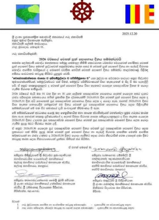 ත්රෛනිකායික මහනාහිමිවරුන්ගේ ඉල්ලීම සැලකිල්ලට ගනිමින් පොහොය කමිටුවේ නිර්දේශ මත මෙම තීරණය ගත් බවයි රාජ්ය පරිපාලන, පළාත් සභා හා පළාත් පාලන අමාත්ය මහාචාර්ය චන්දන අබේරත්න මහතා පැවසුවේ.