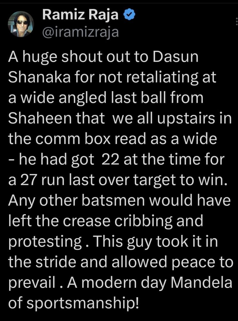 ෂහීන් ෂා අෆ්රිඩ් යැවූ අවසන් පන්දුව වයිඩ් පන්දුවක් ලෙස අප සැවොම දැක්කා ඊට එරෙහිව කිසිදු විරෝධයක් නොදැක්වීම පිළිබඳව දසුන් ශානකට මාගේ ඉහළම ප්රශංසාව.