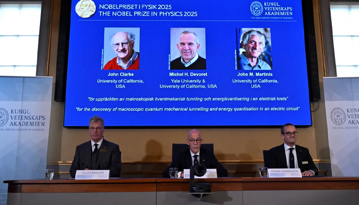 Nobel Prize in Physics 2025 2025 වසරේ භෞතික විද්යාව සඳහා වූ නොබෙල් ත්යාගය බි්රතාන්ය, ප්රංශ සහ අමෙරිකානු ජාතික විද්යාඥයින් තිදෙනාට October 7, 2025 7:45pm